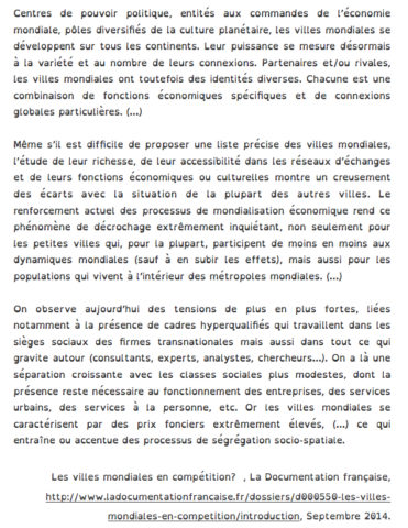 Comment la concurrence entre les villes mondiales se manifeste-t-elle? Je trouve dans les documents des preuves qui me permettent de répondre à chaque élément demandé dans les critères ci-dessous.